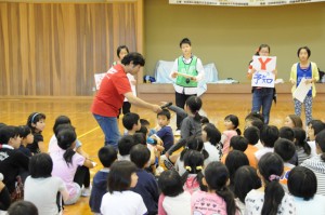 その後は「呼ばれた人は立ってみようゲーム」という自分が呼ばれたな。と思ったら元気よく返事をして立つという簡単なゲームをします。「男の子」や「小学校3年生4年生」などと性別やどの学年の子がどれくらいいるかが分かりながら簡単な屈伸運動にもなります。その流れで現地スタッフ、全子連スタッフを紹介します。