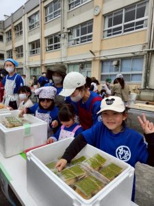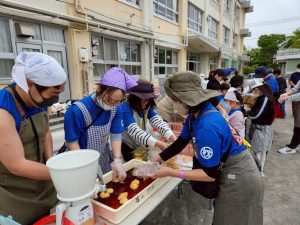 上篠崎自治会さんやPTA.おやじの会と協力して行ったもちつき大会!今年は140kgの餅米を蒸してついたよ!7種類以上の味を用意しました。子ども会は味付けと梱包担当!飲み物もたくさん販売しました。春にやる餅つきもなかなかいいですよ〜