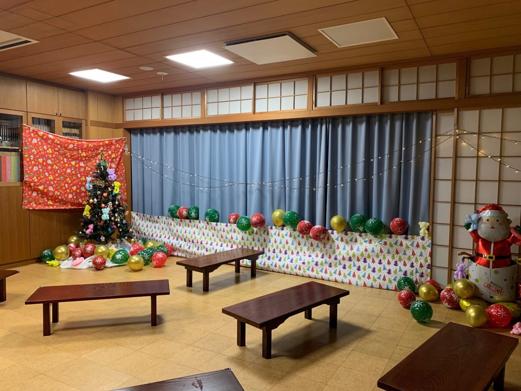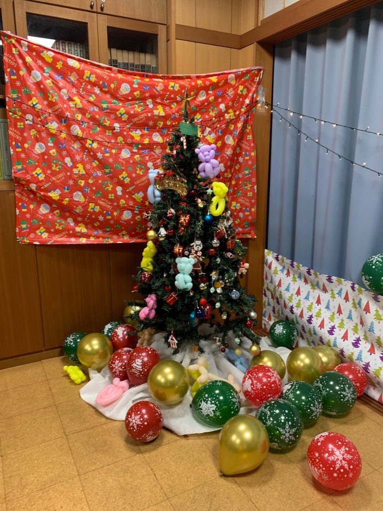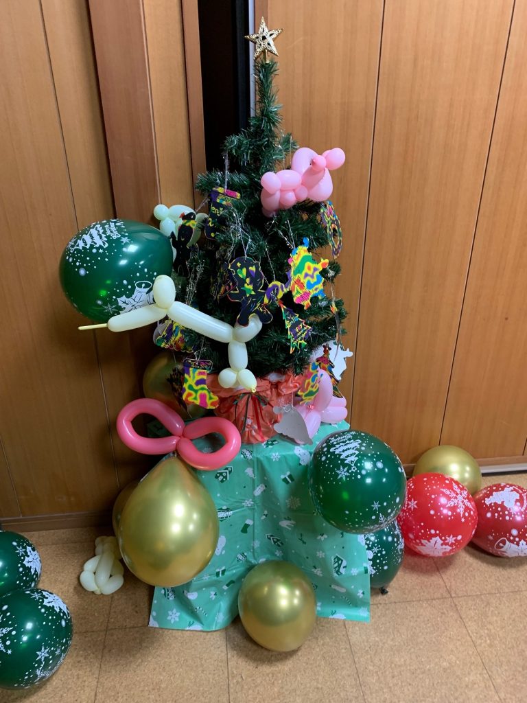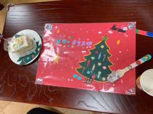 クリスマス会では会場の装飾をしたり、ケーキを食べるためのランチョンマット製作をしました! 素敵なサンタさんからもおかしをもらいました!
