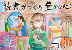 福岡県教育委員会賞を受賞した小学 5年生 衛藤さんの作品は、全体の構図が流れるような印象で、力強い言葉のとおり、まさに「読書で旅をしている」表現力に心のウキウキ感が伝わってきました。
