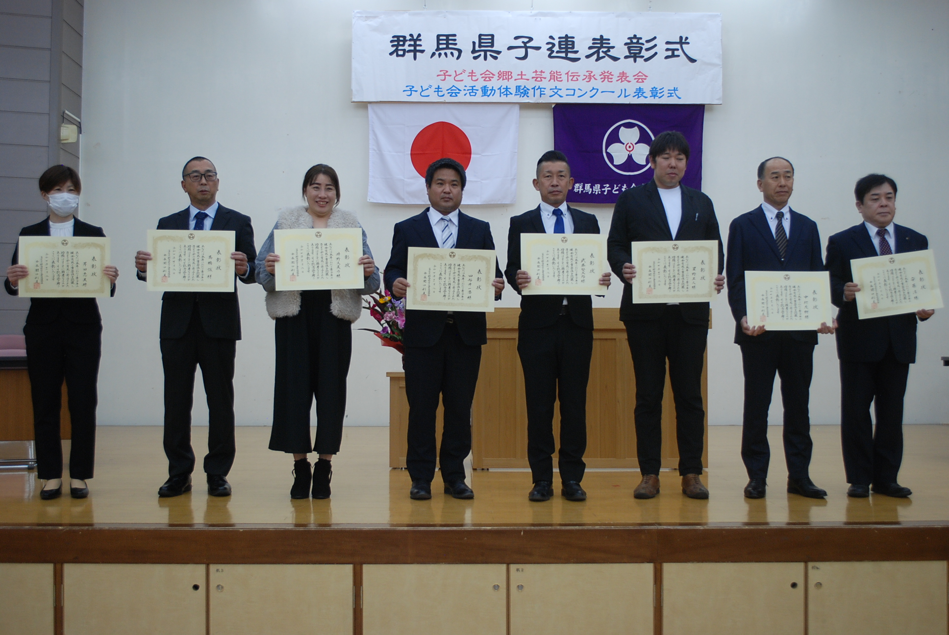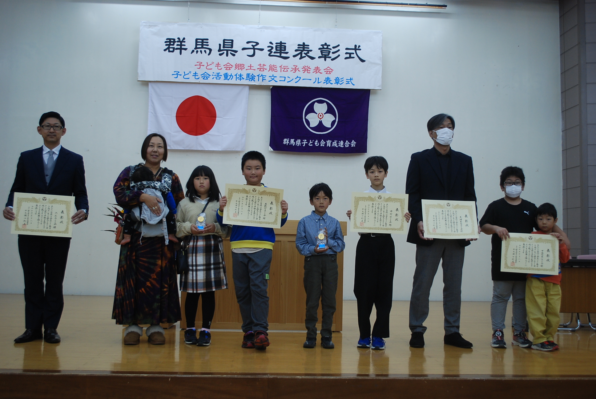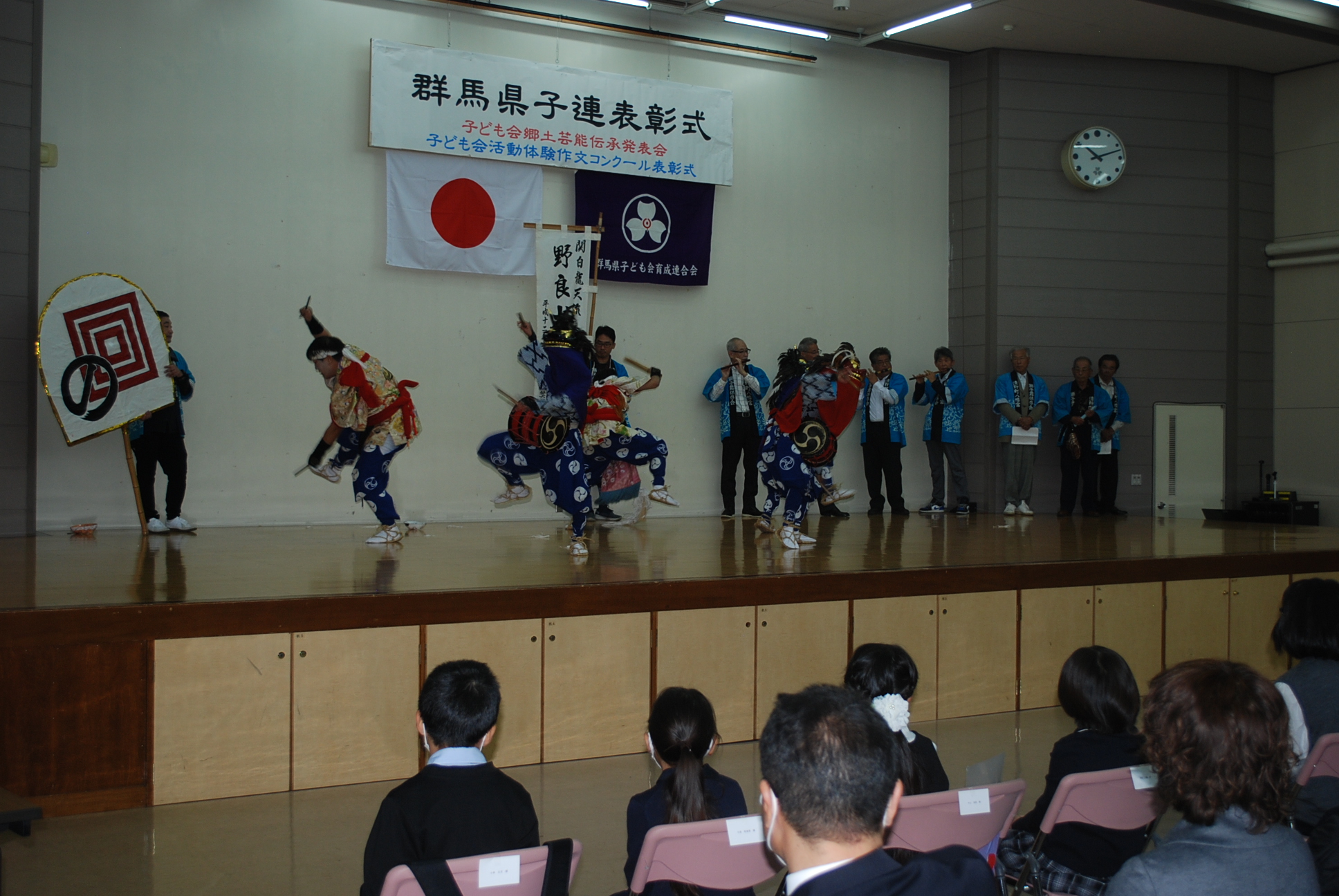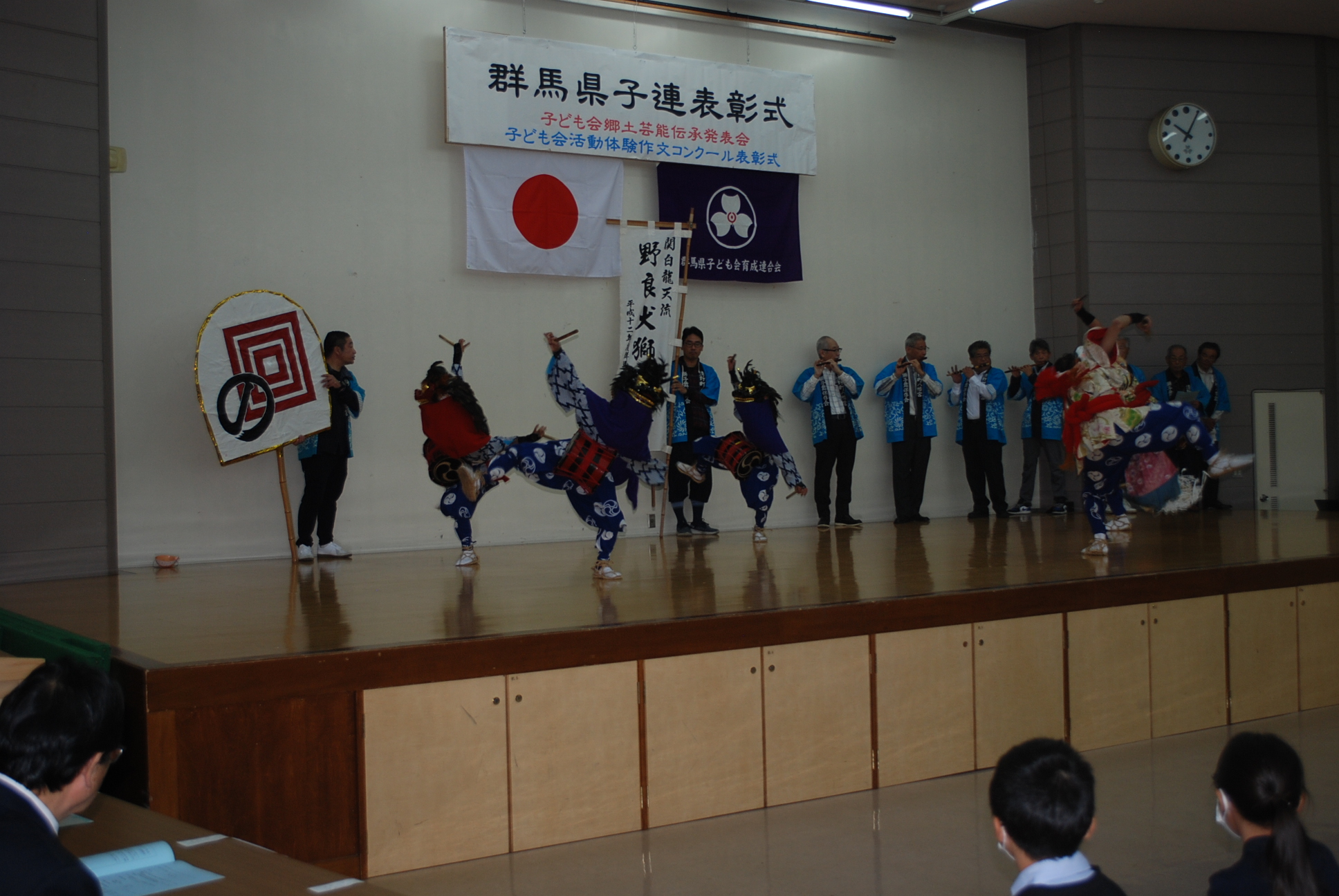 令和7年11月8日(土)に群馬県青少年会館(前橋市荒牧町)にて、群馬県教育委員会事務局都丸生涯学習課長様、(公財)群馬県青少年育成事業団大川理事長様、群馬県青少年会館金子館長様にご出席いただき、「群馬県子連会長表彰式・子ども会郷土芸能伝承発表・子ども会活動体験作文コンクール表彰・発表」を開催しました。これまで永年にわたり活動を続けてこられた子ども会、育成者・指導者、育成組織の表彰、子ども会活動体験作文コンクールの優秀賞受賞者の表彰を行いました。また、表彰に先立ち前橋市の清野町野良犬獅子舞保存会(清野町子ども会)により永年地域に受け継がれてきている獅子舞を披露していただきました。