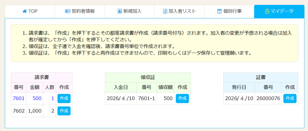 支払予定日を入力し、加入者の決定をするとマイデータに請求書が作成されます。