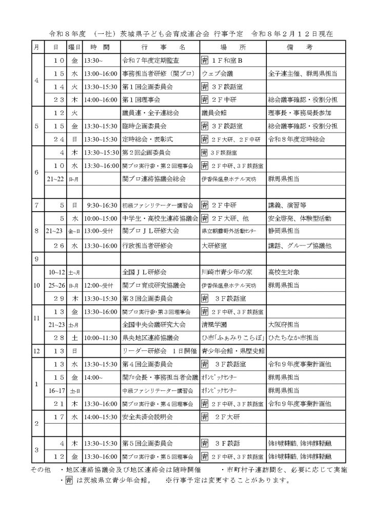 令和8年度茨子連等行事予定表⇒