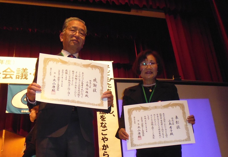 この大会のなかで「平成26年度 公益法人 全国子ども会連合会表彰式」が行われ、神奈川県からは20年以上子ども会活動に携わってこられた星野敏雄氏(綾瀬市)と小島孝子氏(秦野市)が全国子ども会表彰を受賞されました。お二人のご尽力に心より感謝するとともにお祝い申し上げます。