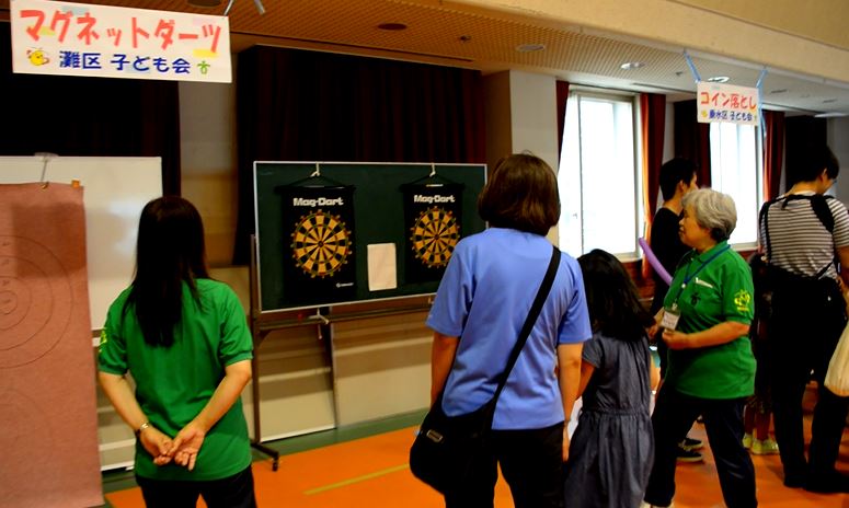 一方、もうひとつの会場であるこべっこホールでは、こちらも各区のブースが所狭しと軒を並べていて、マグネットダーツやコイン落とし、糸電話やゴム鉄砲的当てや折り紙、影絵やパターゴルフなど、たくさんの催し物でにぎわいを見せていました。