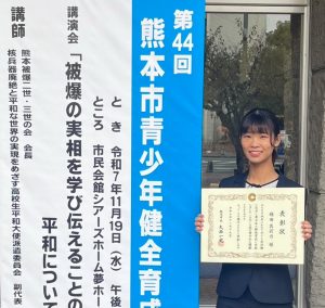熊本市子ども会育成協議会のユース・リーダーに属する稲田真莉乃さんが、令和7年11月19日に市民会館シアーズホーム夢ホー…