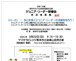 対象者:熊本市内在住の小学6年生~高校1年生(R8.1月現在)で、ジュニア・リーダー(JL)に興味がある人、またはジュニア・リーダーになりたい人。