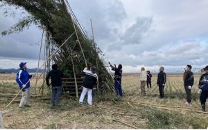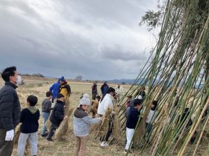 前日には保護者や自治会役員の皆様と協力し、竹切りや櫓の土台組を行いました。当日は子どもたちが12月に手作りしたしめ縄飾りを持ち寄り、藁運びも手伝いながら立派な櫓を完成させました。