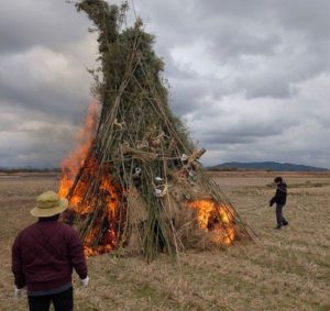 点火の際には歓声が上がり、竹が燃える音が響く中、子どもからお年寄りまで地域の皆さんと一緒に無病息災と五穀豊穣を祈願しました。途中、雪が降る場面もありましたが、怪我もなく無事に行事を終えることができました。