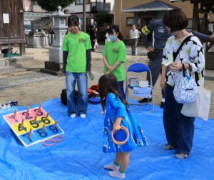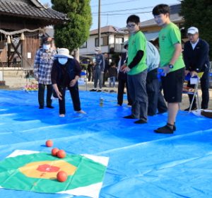 その後は、射的(公民館)、ディスゲッター、輪投げ、ボッチャ(神社境内)の4つのゲームに分かれて担当しました。それぞれのゲームでみんなが一喜一憂し、時間があっという間に過ぎたようでした。ボッチャは経験した人はほとんど居ない様で、ボールの重さや感触に戸惑いながらも楽しんでいました。