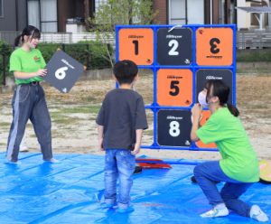 要請によりジュニア・リーダーを派遣しました。前日まで文化祭で忙しかったり、当日午後からは部活で別のイベントへ参加したりとそれぞれ忙しい中に中学生6人、高校生3人の計9人が積極的に参加してくれました。イベントの最初に自己紹介をして、子どもからお年寄りまで参加できる「ジョンブラウンのおじさん」という手遊びをしました。1から10までのの数字を指で表すもので、最初は初めての人はゆっくりでも難しく、慣れても次はどんどん早くなってやはり難しくなります。それでもみんな一生懸命参加して楽しいスタートになりました。