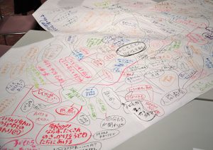 一つの会場内で5テーブルにそれぞれのテーマを決め、プロジェクター、スクリーンで会場内に映し出されたタイムスケジュールにそって、推進研のメンバーがホストとなり、参加者全員がすべてのテーブルを回り意見を出し合う。出し合った意見を模造紙に記載し、必要があればわかりやすく図式化し、最後に全員で共有しました。