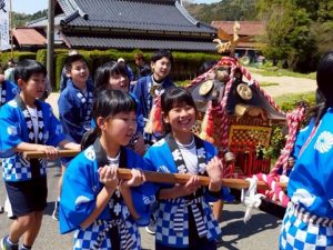 子どもの参加があることで、賑わいをもたらし、祭りが活気づいた。 子どもたちにとっては、力を合わせて神輿を担いだり、巫女となったり、伝統文化に触れるよい機会となった。 (宇部市 小野地区子ども会・文化財愛護活動)