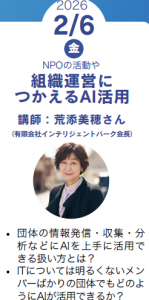 今回の演題は「NPOの活動や組織運営につかえるAI活用」、講師は有限会社インテリジェントパーク会長の荒添美穂さんです。