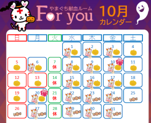 山口県赤十字血液センターから10月の献血カレンダーが届きました。 ご協力のほどよろしくお願いします。 2025年献血ルー